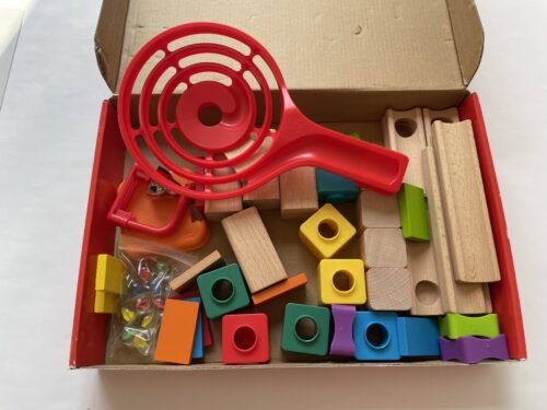 ■内 容 :うずまきレール×1、木製レール×6、積み木(小)×4、積み木(大)×4、ジョイントブロック×7、ジョイントリング×3、ドミノ×12、ベル×1、ベル(土台)×1、ビー玉キャッチャー×1、ビー玉×10、組み立てガイドブック×1
