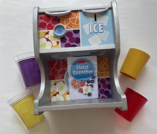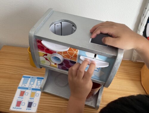 ジュースディスペンサーで、お店屋さんごっこができる木製のおもちゃ。