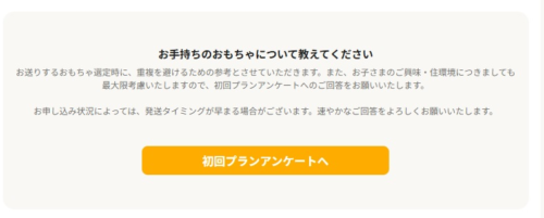 その後、被り防止のために手持ちのおもちゃや、子どもの興味や発達に合わせるためのアンケートが届きました。